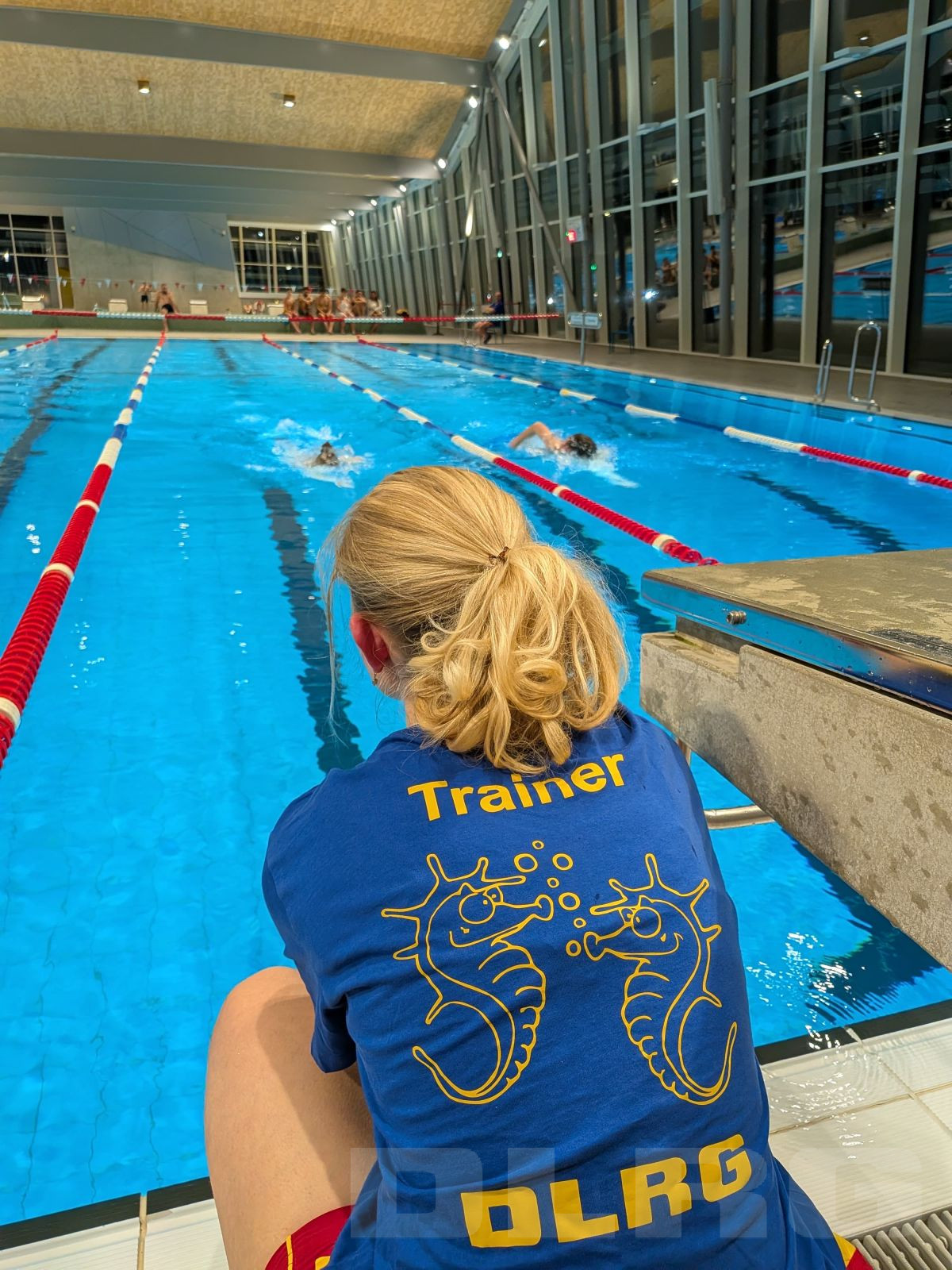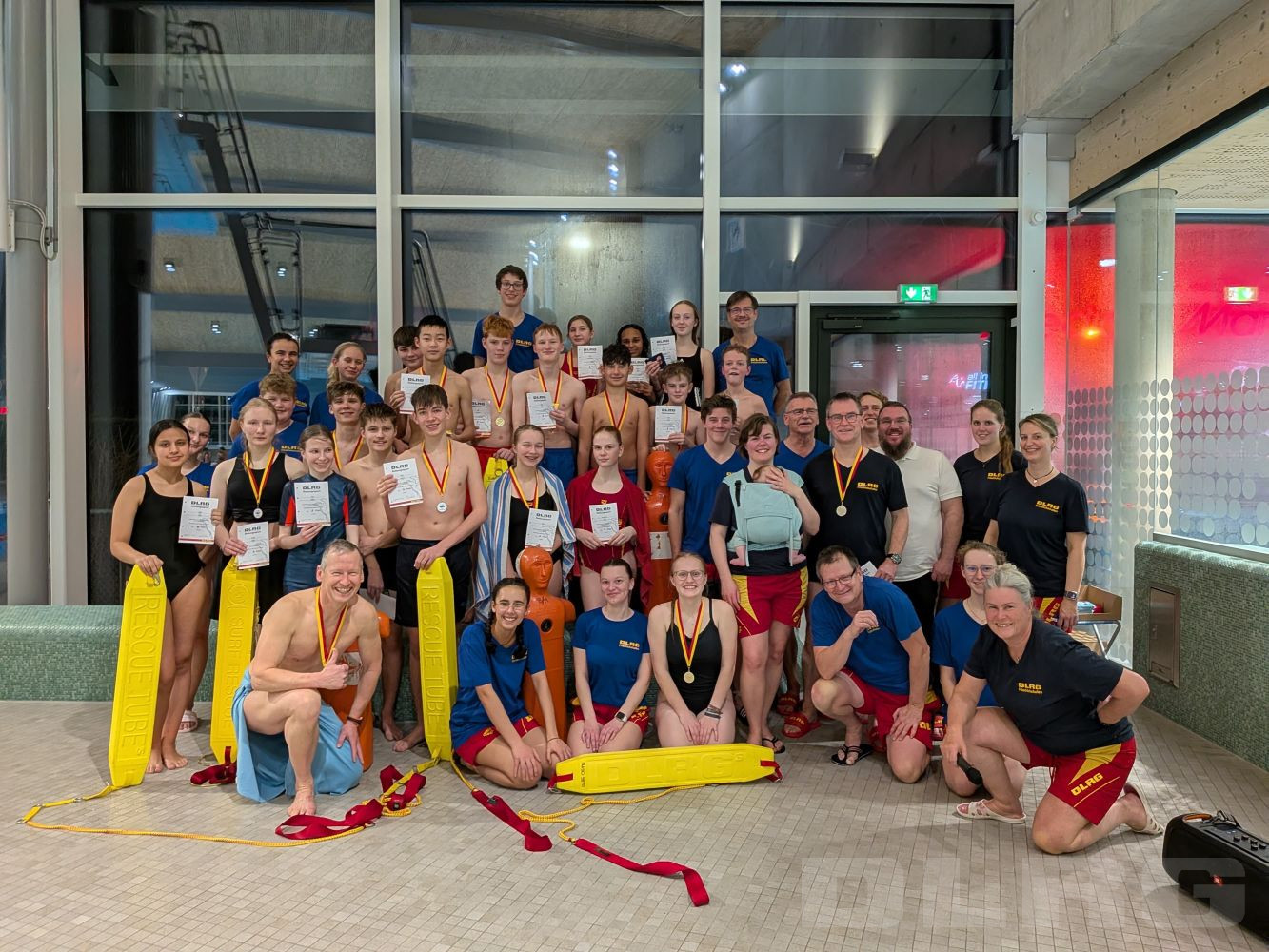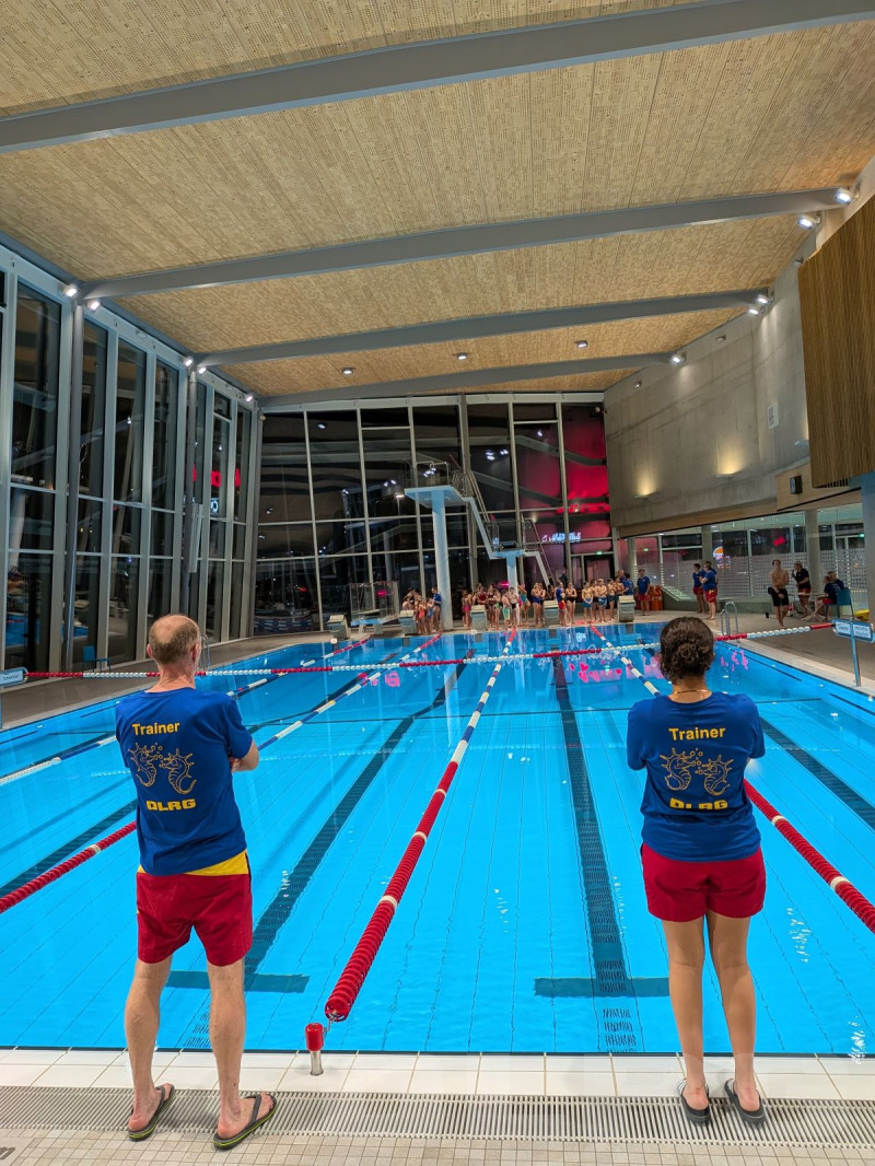 Währenddessen liefen im Bereich des Schwimmbeckens, die letzten Vorbereitungen. Eilig wurden noch ein paar Posten an die spontan noch erschienenen Riegenführer und Ausbilder vergeben, da an diesem Tage einige Krankheitsmeldungen ein Loch in den bisherigen Plan rissen. Eine Musikbox und Tische wurden aufgestellt. Listen noch schnell von unserem Erste-Hilfe-Ausbilder und IT-Profi Patrick Gleich ausgedruckt. Markus Rank von der Ortsgruppe Bermatingen brachte noch schnell ein paar Puppen und Gurtretter vorbei, da wir selber leider nicht über so viel Rettungsmaterial verfügten.